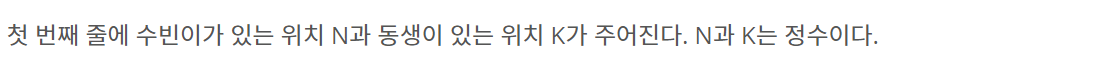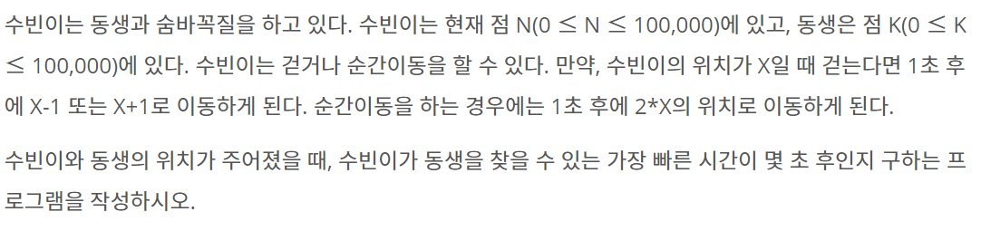 수빈이는 동생과 숨바꼭질을 하고 있다. 수빈이는 현재 점 N(0 ≤ N ≤ 100,000)에 있고, 동생은 점 K(0 ≤ K ≤ 100,000)에 있다. 수빈이는 걷거나 순간이동을 할 수 있다. 만약, 수빈이의 위치가 X일