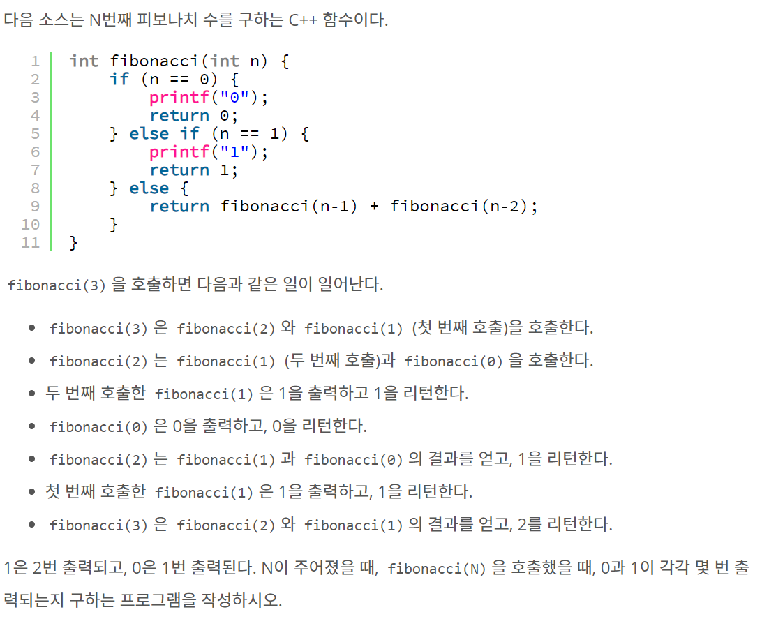 문제에서 주어진 재귀 함수 fibonacci를 살짝 변형해 0과 1에서 count 값을 셌다.