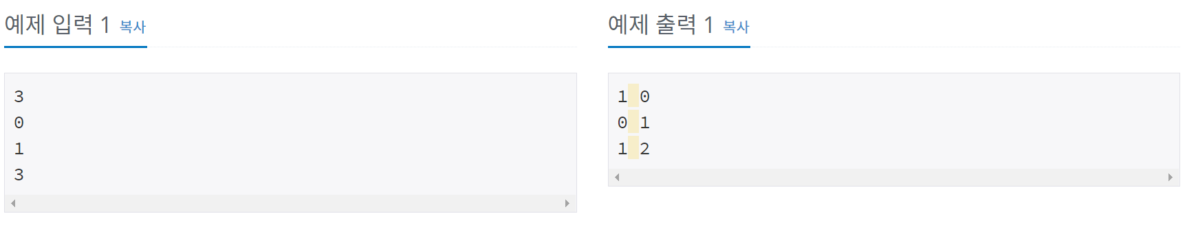 각 테스트 케이스마다 0이 출력되는 횟수와 1이 출력되는 횟수를 공백으로 구분해서 출력한다.