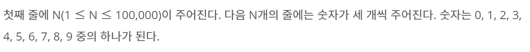 첫째 줄에 N(1 ≤ N ≤ 100,000)이 주어진다. 다음 N개의 줄에는 숫자가 세 개씩 주어진다. 숫자는 0, 1, 2, 3, 4, 5, 6, 7, 8, 9 중의 하나가 된다.