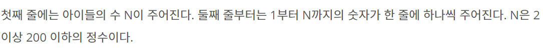 KOI 어린이집에는 N명의 아이들이 있다. 오늘은 소풍을 가는 날이다. 선생님은 1번부터 N번까지 번호가 적혀있는 번호표를 아이들의 가슴에 붙여주었다. 선생님은 아이들을 효과적으로 보호하기