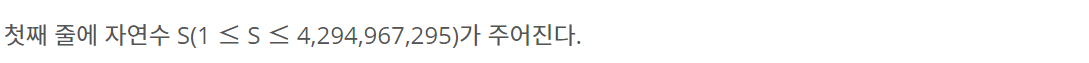 첫째 줄에 자연수 S(1 ≤ S ≤ 4,294,967,295)가 주어진다.