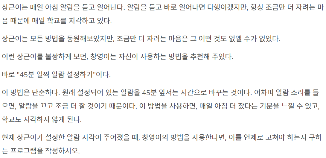 상근이는 매일 아침 알람을 듣고 일어난다. 알람을 듣고 바로 일어나면 다행이겠지만, 항상 조금만 더 자려는 마음 때문에 매일 학교를 지각하고 있다. 상근이는 모든 방법을 동원해보았지만,