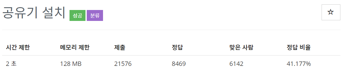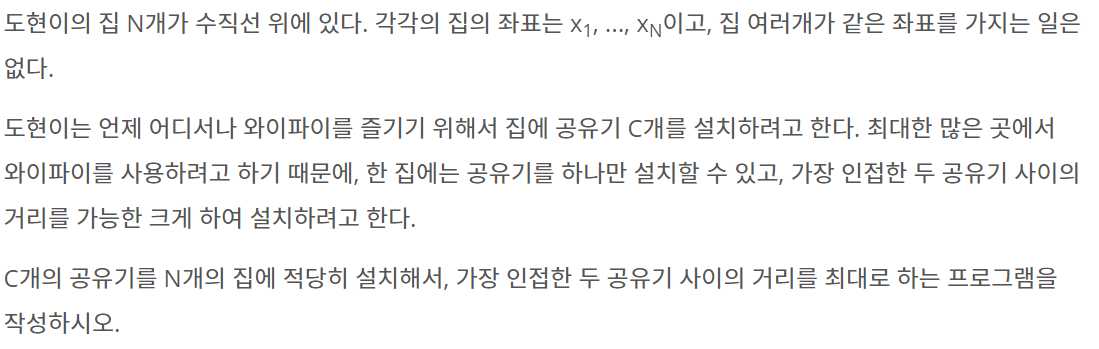 문제 요약: 공유기를 설치할 건데 가능한 멀리 설치하고 싶다. (같은 좌표는 없다)