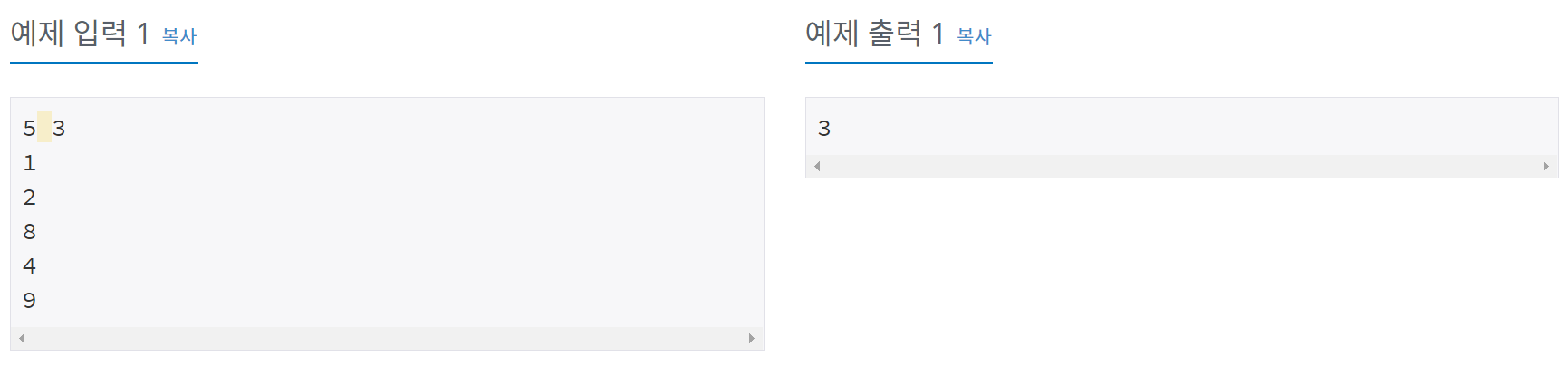 첫째 줄에 집의 개수 N (2 ≤ N ≤ 200,000)과 공유기의 개수 C (2 ≤ C ≤ N)이 하나 이상의 빈 칸을 사이에 두고 주어진다. 둘째 줄부터 N개의 줄에는 집의 좌표를 나타내는 xi (0 ≤ xi ≤ 1,000,000,000)가