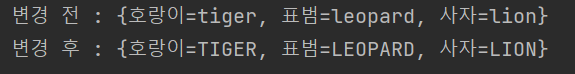 HashMap의 원소는 키로 한글 동물 이름, 값으로 소문자 영어 동물 이름으로 구성되어 있는데, 다음 실행 결과가 나타나도록 Map 인터페이스의 replaceAll()를 사용하여 프로그램하라.