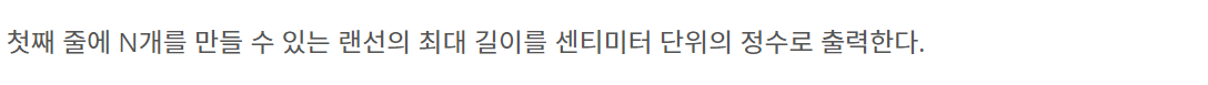 첫째 줄에는 오영식이 이미 가지고 있는 랜선의 개수 K, 그리고 필요한 랜선의 개수 N이 입력된다. K는 1이상 10,000이하의 정수이고, N은 1이상 1,000,000이하의 정수이다. 그리고 항상 K ≦ N 이다. 그