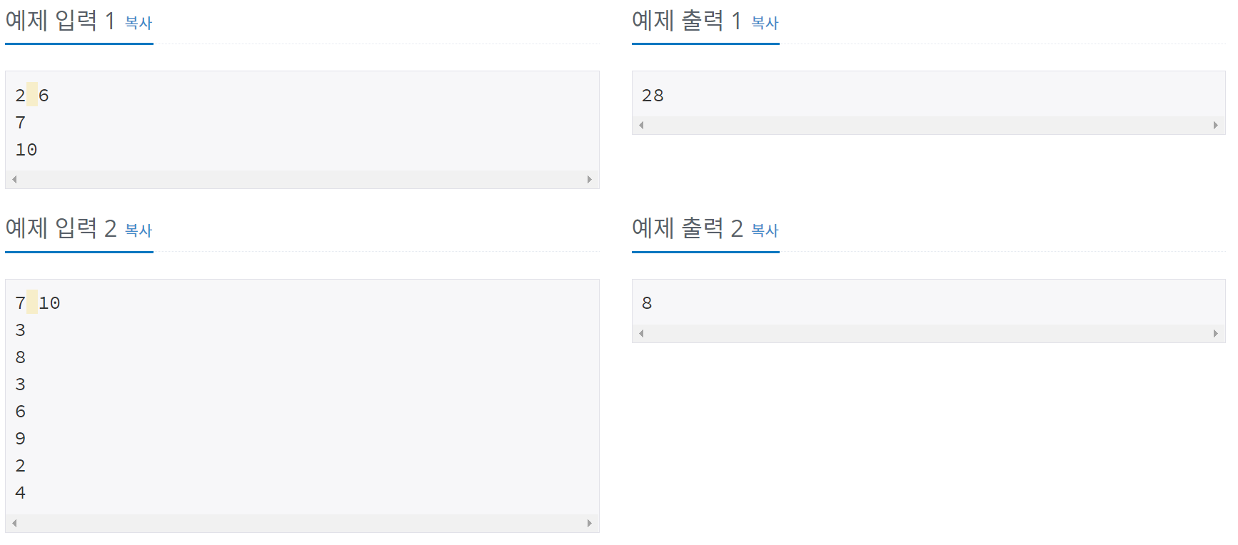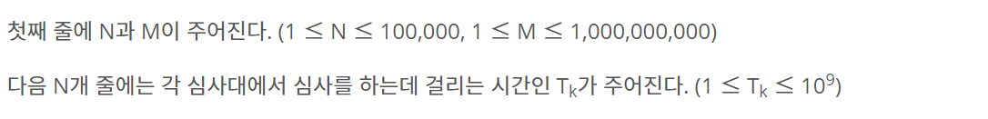 첫째 줄에 N과 M이 주어진다. (1 ≤ N ≤ 100,000, 1 ≤ M ≤ 1,000,000,000) 다음 N개 줄에는 각 심사대에서 심사를 하는데 걸리는 시간인 Tk가 주어진다. (1 ≤ Tk ≤ 109)