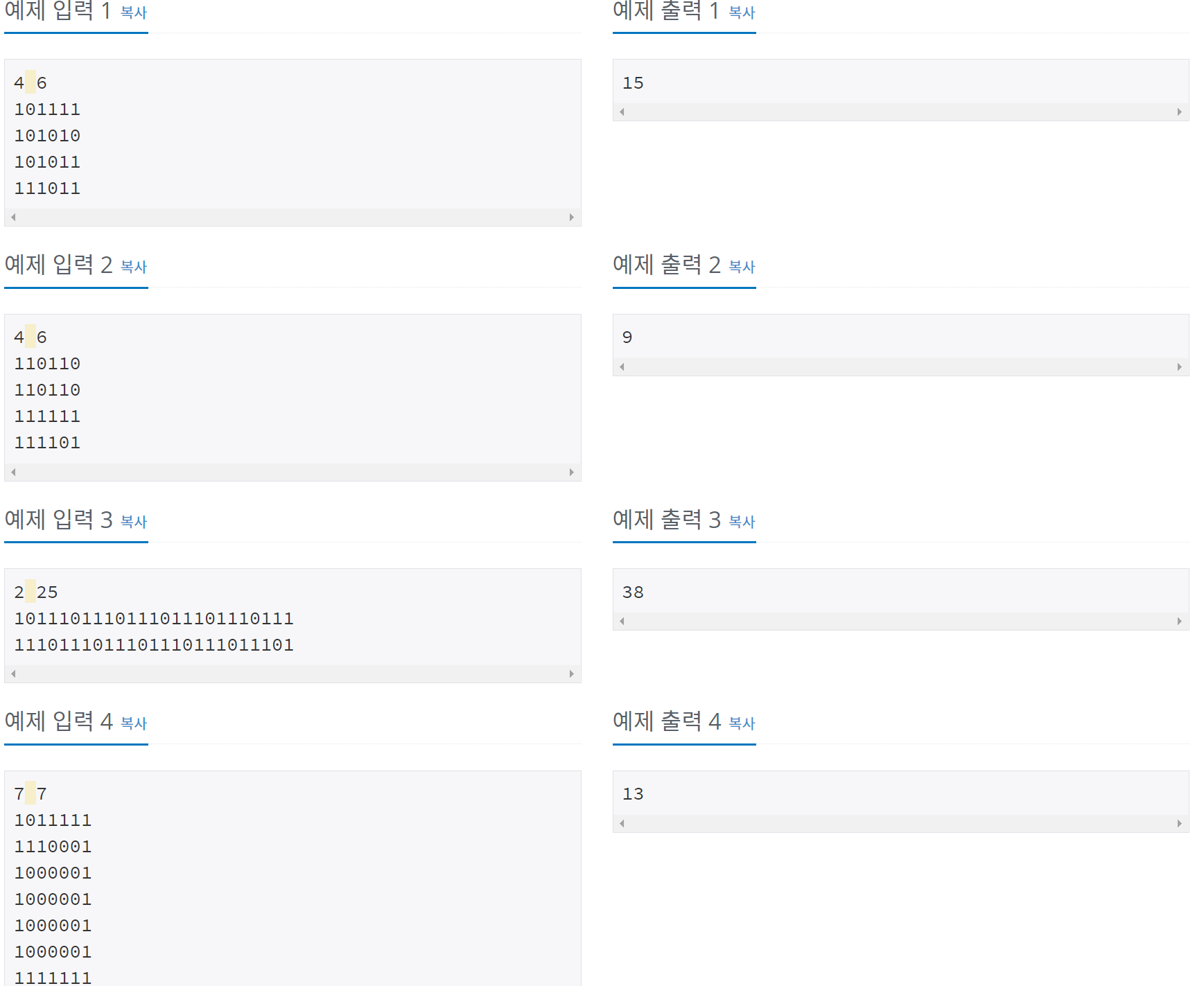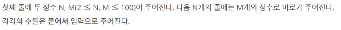 첫째 줄에 두 정수 N, M(2 ≤ N, M ≤ 100)이 주어진다. 다음 N개의 줄에는 M개의 정수로 미로가 주어진다. 각각의 수들은 붙어서 입력으로 주어진다.