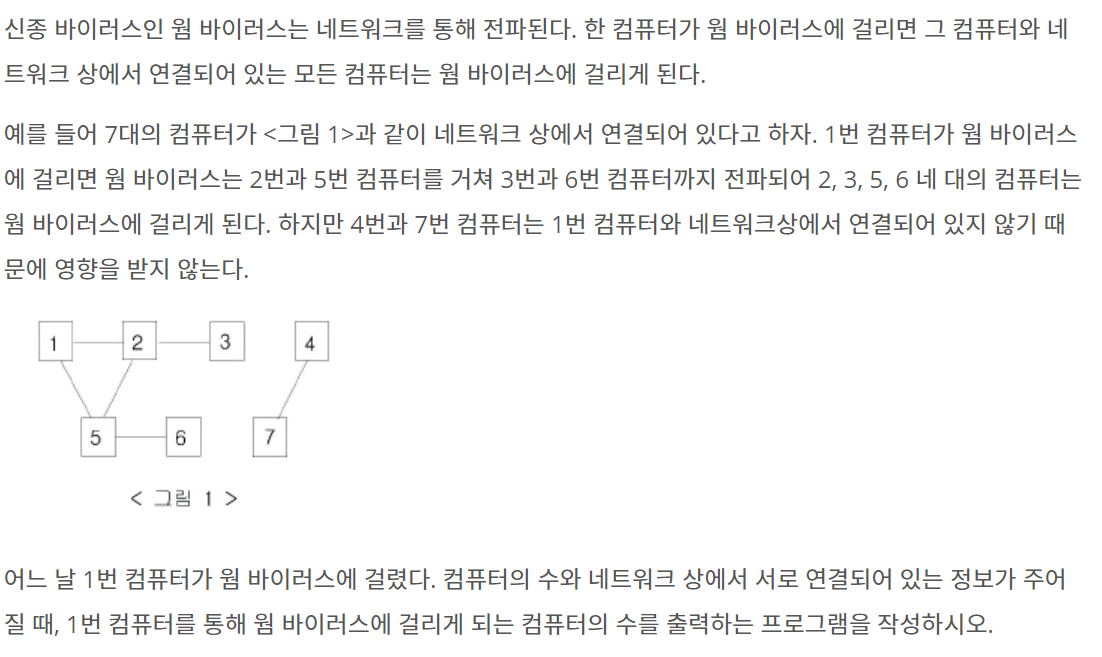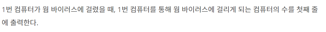 첫째 줄에는 컴퓨터의 수가 주어진다. 컴퓨터의 수는 100 이하이고 각 컴퓨터에는 1번 부터 차례대로 번호가 매겨진다. 둘째 줄에는 네트워크 상에서 직접 연결되어 있는 컴퓨터 쌍의 수가 주어