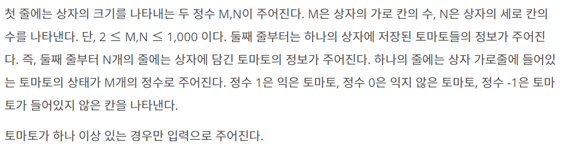 첫 줄에는 상자의 크기를 나타내는 두 정수 M,N이 주어진다. M은 상자의 가로 칸의 수, N은 상자의 세로 칸의 수를 나타낸다. 단, 2 ≤ M,N ≤ 1,000 이다. 둘째 줄부터는 하나의 상자에 저장된 토마토