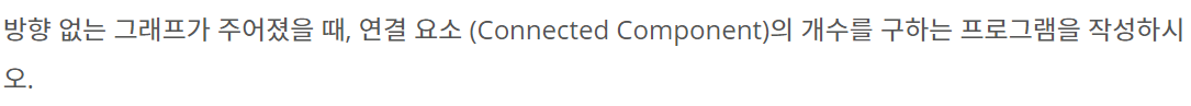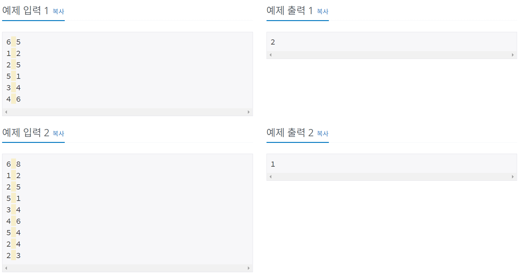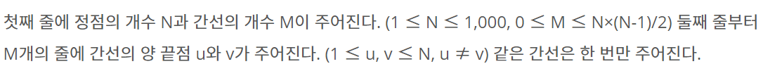 첫째 줄에 정점의 개수 N과 간선의 개수 M이 주어진다. (1 ≤ N ≤ 1,000, 0 ≤ M ≤ N×(N-1)/2) 둘째 줄부터 M개의 줄에 간선의 양 끝점 u와 v가 주어진다. (1 ≤ u, v ≤ N, u ≠ v) 같은 간선은 한 번만 주