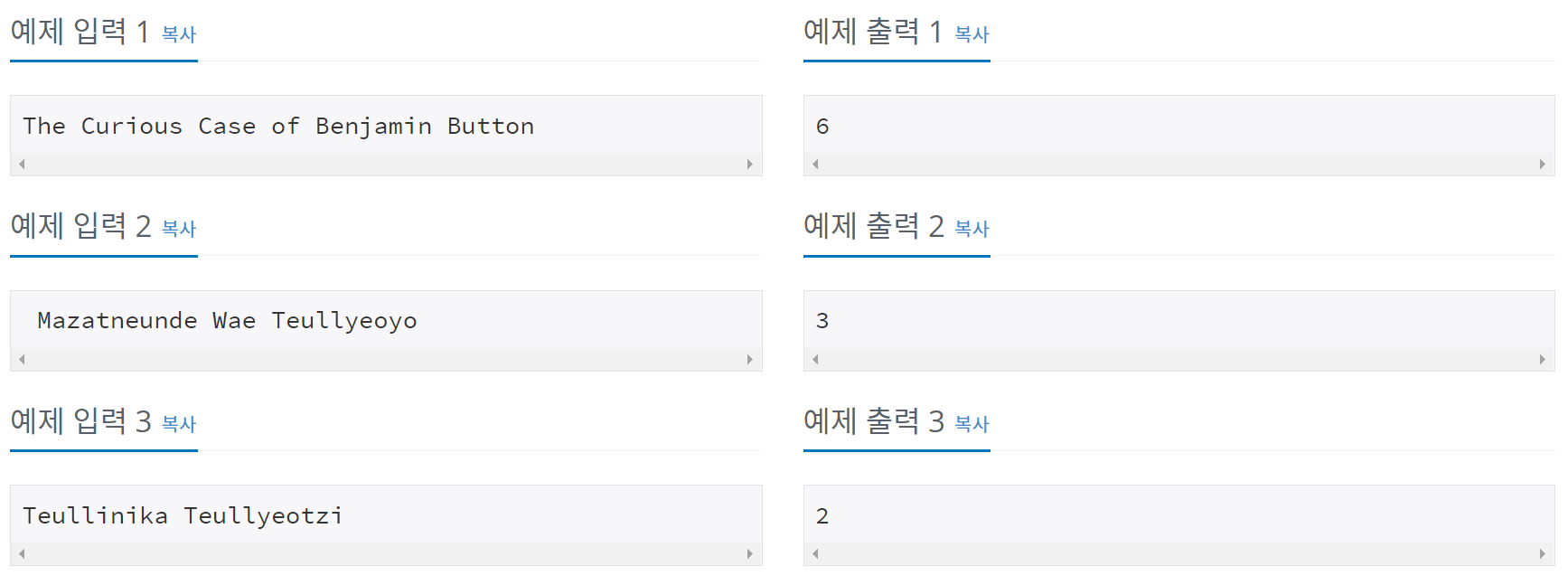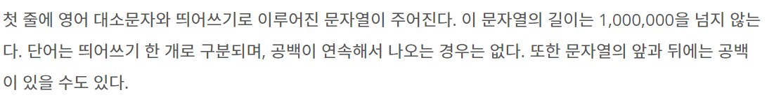 첫 줄에 영어 대소문자와 띄어쓰기로 이루어진 문자열이 주어진다. 이 문자열의 길이는 1,000,000을 넘지 않는다. 단어는 띄어쓰기 한 개로 구분되며, 공백이 연속해서 나오는 경우는 없다. 또한