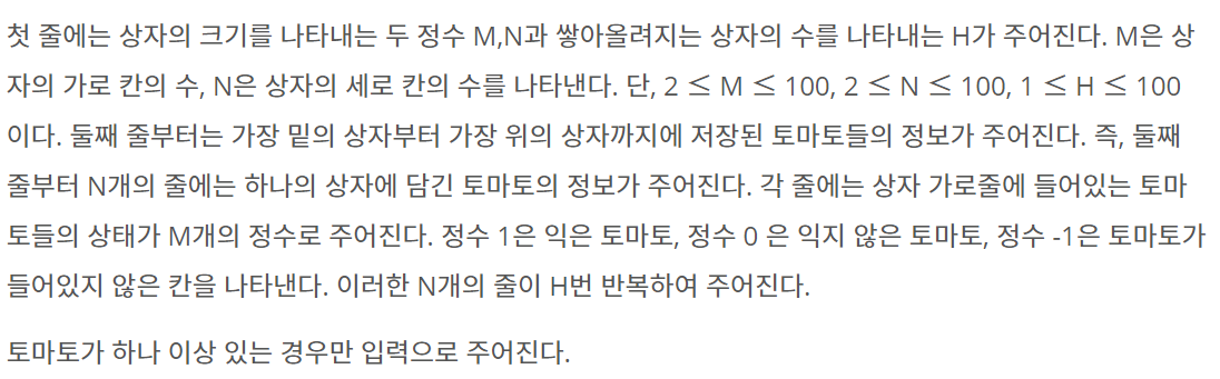 첫 줄에는 상자의 크기를 나타내는 두 정수 M,N과 쌓아올려지는 상자의 수를 나타내는 H가 주어진다. M은 상자의 가로 칸의 수, N은 상자의 세로 칸의 수를 나타낸다. 단, 2 ≤ M ≤ 100, 2 ≤ N ≤ 100,