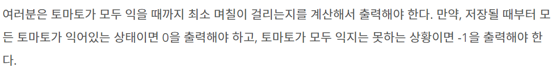 첫 줄에는 상자의 크기를 나타내는 두 정수 M,N이 주어진다. M은 상자의 가로 칸의 수, N은 상자의 세로 칸의 수를 나타낸다. 단, 2 ≤ M,N ≤ 1,000 이다. 둘째 줄부터는 하나의 상자에 저장된 토마토