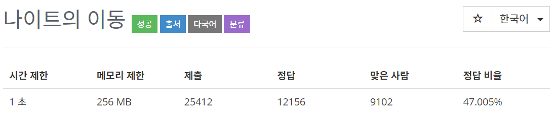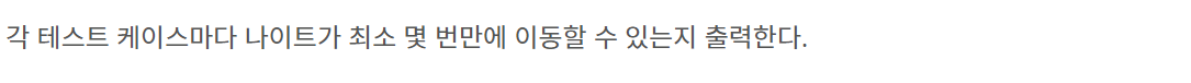 체스에서 나이트를 움직이는 방법은 두 칸 전진 후, 전진한 방향에서 오른쪽 혹은 왼쪽 중 한 방향으로 한 칸을 이동할 수 있다.