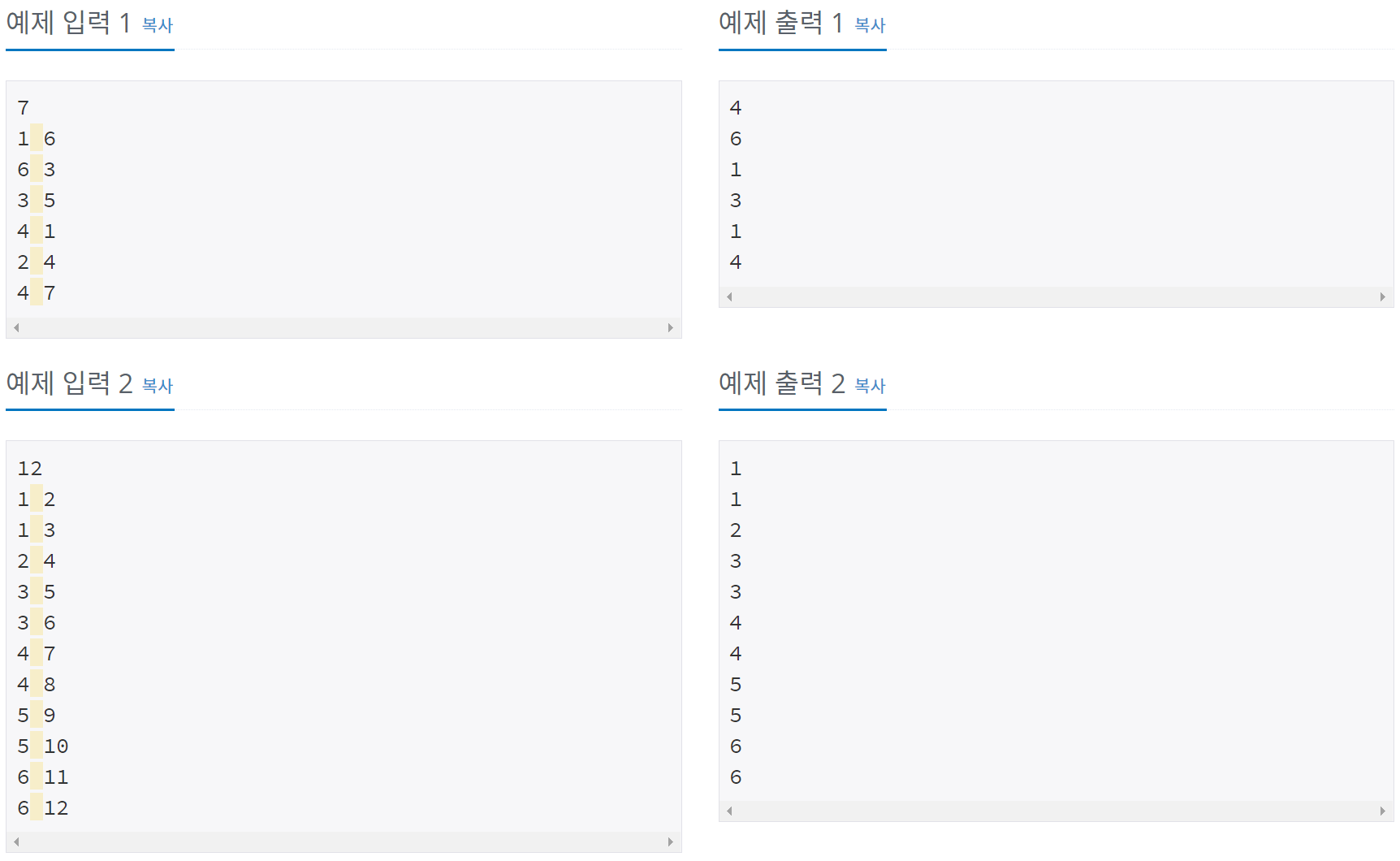 루트 없는 트리가 주어진다. 이때, 트리의 루트를 1이라고 정했을 때, 각 노드의 부모를 구하는 프로그램을 작성하시오.