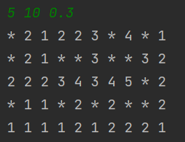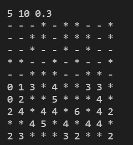 - 숨긴 지뢰가 있는 원소는 *로 표시하고 없는 원소는 -로 표시한다. 원소에 지뢰가 있을 확률은 세 번째 명령행 인수인 p이다.