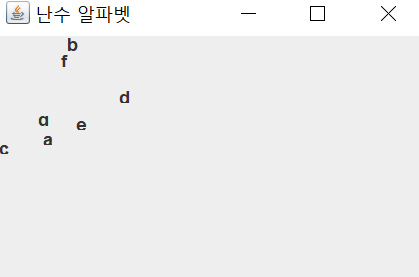 | 알파벳은 JLabel 객체를 사용하고, 화면 크기는 300*200으로 설정한다. 절대 좌표로 GUI 컴포넌트를 배치하려면 배치 관리자가 없어야 한다. |