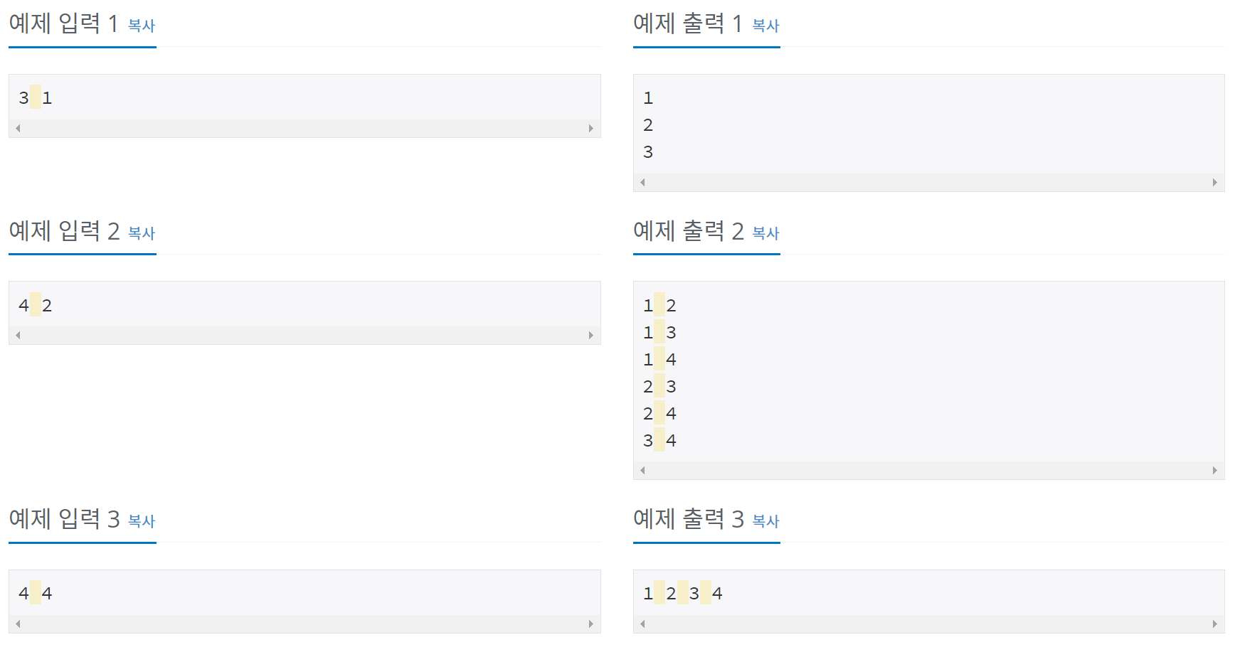 한 줄에 하나씩 문제의 조건을 만족하는 수열을 출력한다. 중복되는 수열을 여러 번 출력하면 안되며, 각 수열은 공백으로 구분해서 출력해야 한다. 수열은 사전 순으로 증가하는 순서로 출력해