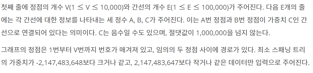 첫째 줄에 정점의 개수 V(1 ≤ V ≤ 10,000)와 간선의 개수 E(1 ≤ E ≤ 100,000)가 주어진다. 다음 E개의 줄에는 각 간선에 대한 정보를 나타내는 세 정수 A, B, C가 주어진다. 이는 A번 정점과 B번 정점이