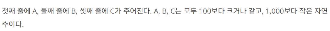 첫째 줄에 A, 둘째 줄에 B, 셋째 줄에 C가 주어진다. A, B, C는 모두 100보다 크거나 같고, 1,000보다 작은 자연수이다.