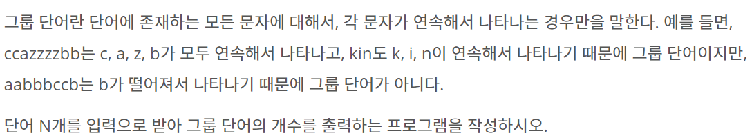 그룹 단어란 단어에 존재하는 모든 문자에 대해서, 각 문자가 연속해서 나타나는 경우만을 말한다. 예를 들면, ccazzzzbb는 c, a, z, b가 모두 연속해서 나타나고, kin도 k, i, n이 연속해서 나타나기 때