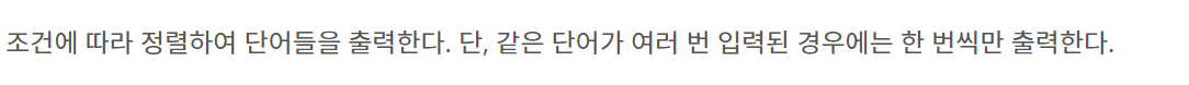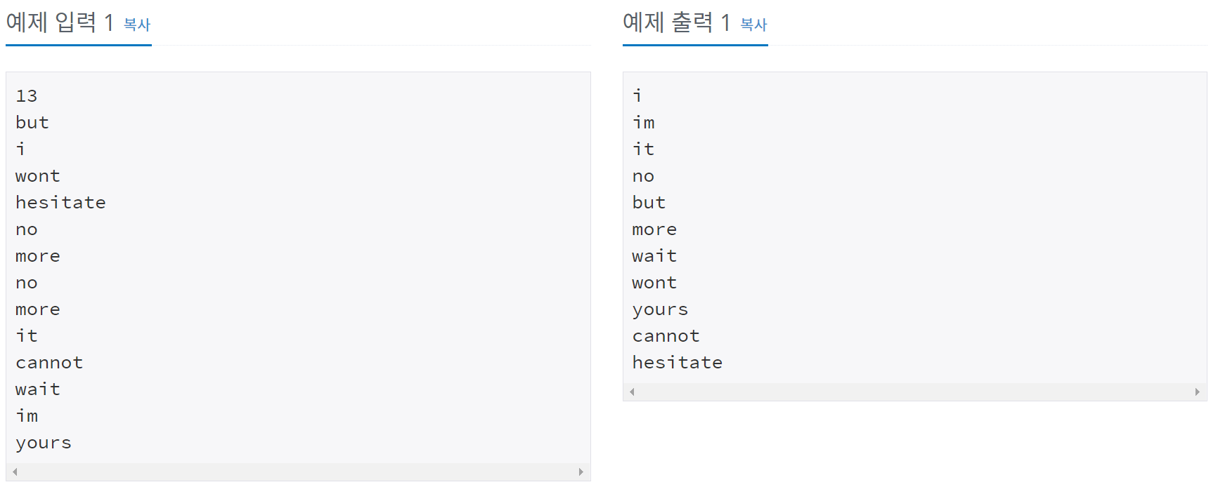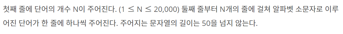 첫째 줄에 단어의 개수 N이 주어진다. (1 ≤ N ≤ 20,000) 둘째 줄부터 N개의 줄에 걸쳐 알파벳 소문자로 이루어진 단어가 한 줄에 하나씩 주어진다. 주어지는 문자열의 길이는 50을 넘지 않는다.