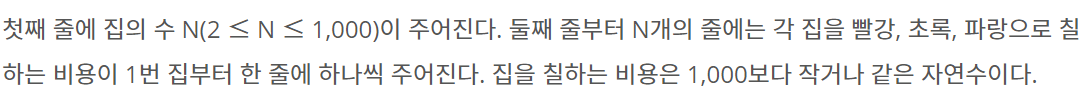 첫째 줄에 집의 수 N(2 ≤ N ≤ 1,000)이 주어진다. 둘째 줄부터 N개의 줄에는 각 집을 빨강, 초록, 파랑으로 칠하는 비용이 1번 집부터 한 줄에 하나씩 주어진다. 집을 칠하는 비용은 1,000보다 작거나