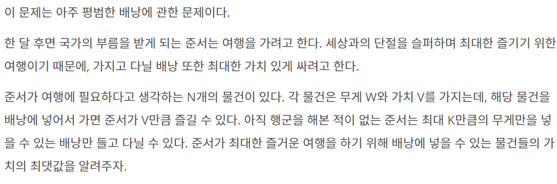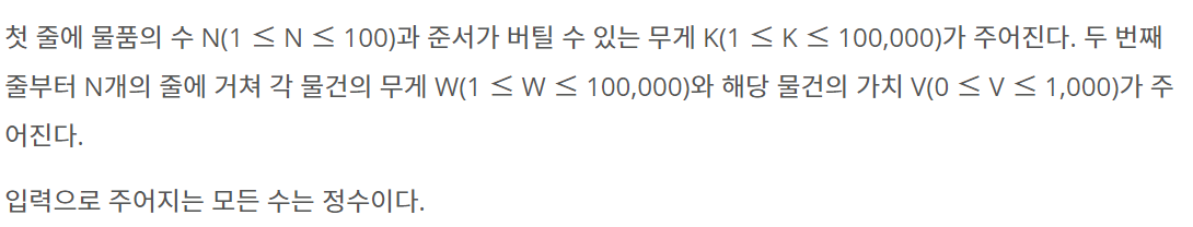 첫 줄에 물품의 수 N(1 ≤ N ≤ 100)과 준서가 버틸 수 있는 무게 K(1 ≤ K ≤ 100,000)가 주어진다. 두 번째 줄부터 N개의 줄에 거쳐 각 물건의 무게 W(1 ≤ W ≤ 100,000)와 해당 물건의 가치 V(0 ≤ V ≤ 1,000)