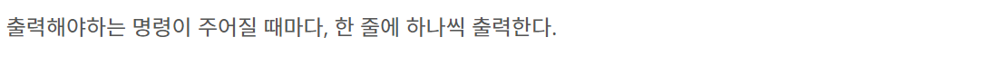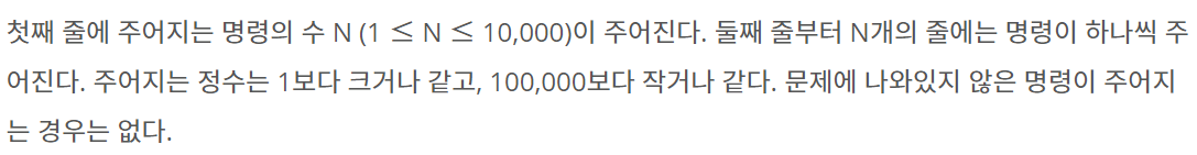 첫째 줄에 주어지는 명령의 수 N (1 ≤ N ≤ 10,000)이 주어진다. 둘째 줄부터 N개의 줄에는 명령이 하나씩 주어진다. 주어지는 정수는 1보다 크거나 같고, 100,000보다 작거나 같다. 문제에 나와있지