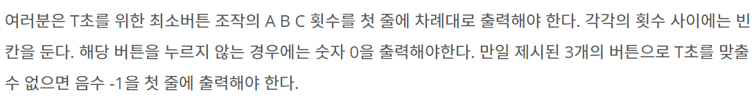 3개의 시간조절용 버튼 A B C가 달린 전자레인지가 있다. 각 버튼마다 일정한 시간이 지정되어 있어 해당 버튼을 한번 누를 때마다 그 시간이 동작시간에 더해진다. 버튼 A, B, C에 지정된 시간은