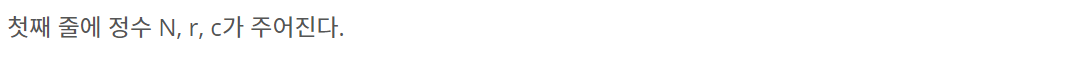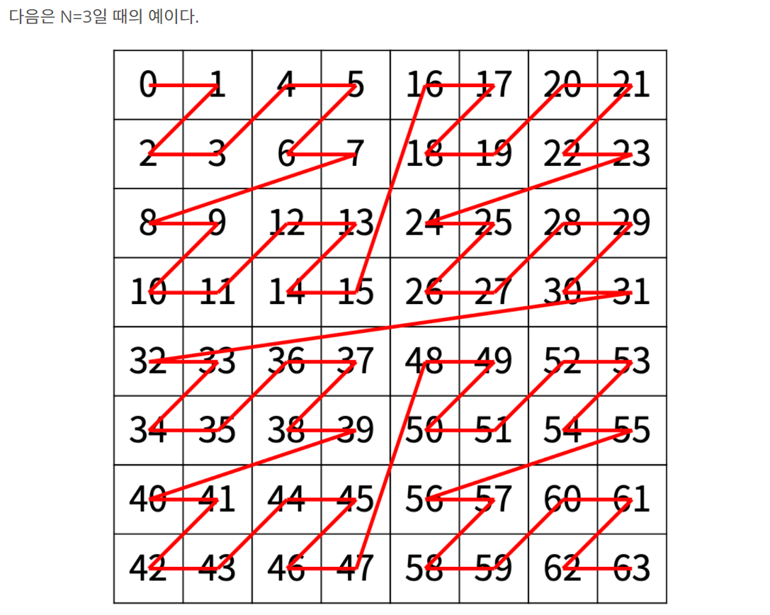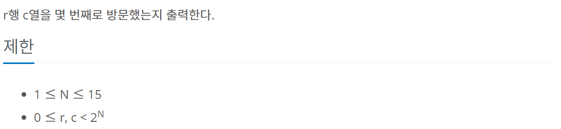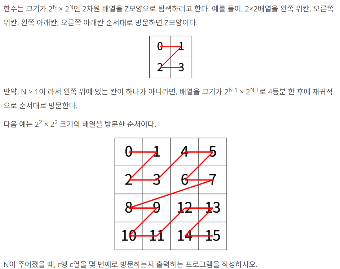 한수는 크기가 2N × 2N인 2차원 배열을 Z모양으로 탐색하려고 한다. 예를 들어, 2×2배열을 왼쪽 위칸, 오른쪽 위칸, 왼쪽 아래칸, 오른쪽 아래칸 순서대로 방문하면 Z모양이다. 만약, N > 1이 라서