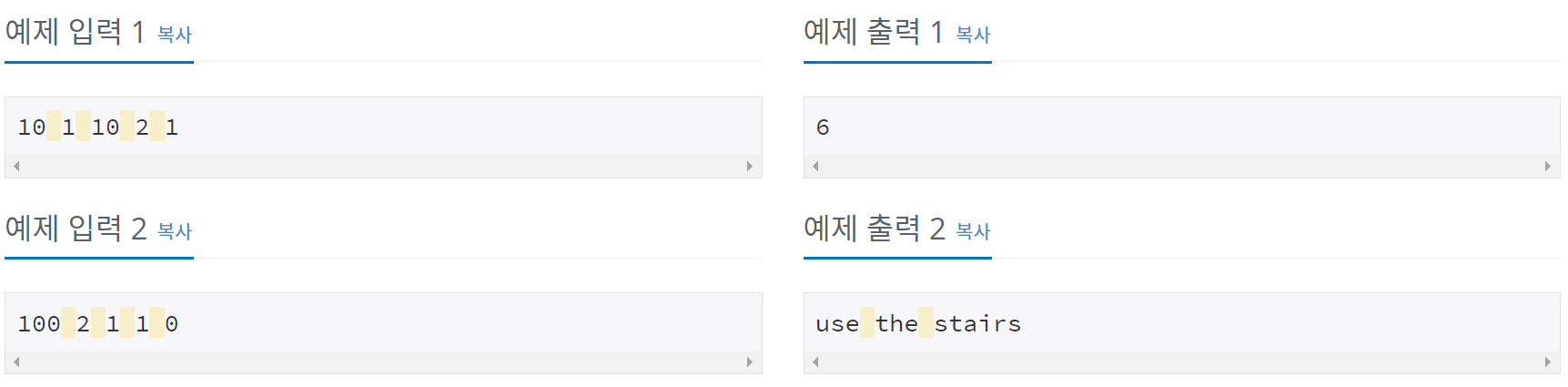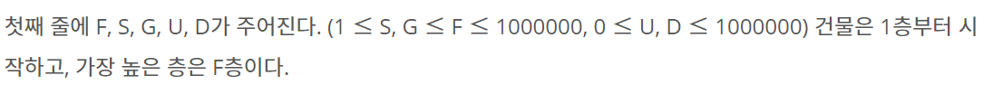 첫째 줄에 F, S, G, U, D가 주어진다. (1 ≤ S, G ≤ F ≤ 1000000, 0 ≤ U, D ≤ 1000000) 건물은 1층부터 시작하고, 가장 높은 층은 F층이다.