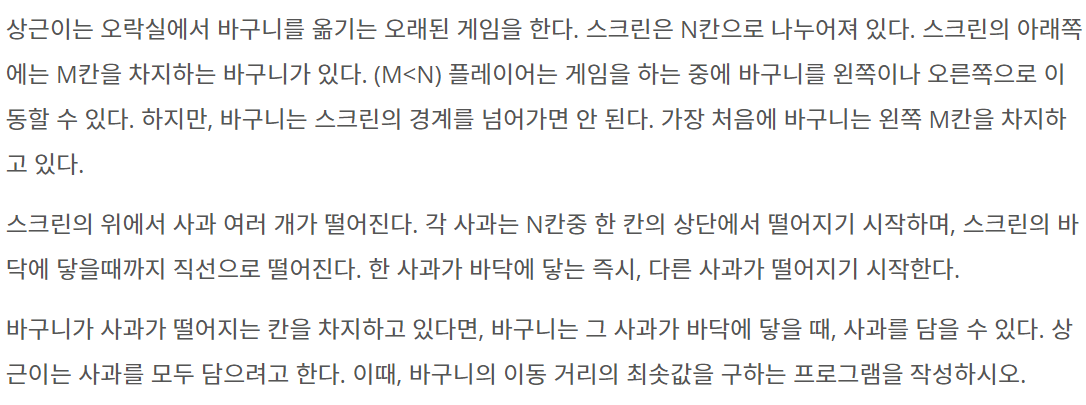 상근이는 오락실에서 바구니를 옮기는 오래된 게임을 한다. 스크린은 N칸으로 나누어져 있다. 스크린의 아래쪽에는 M칸을 차지하는 바구니가 있다. (M<n) 플레이어는="" 게임을="" 하는="" 중에="" 바구니를="" <="" p=""> </n)>