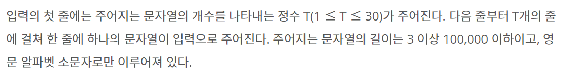 각 문자열이 회문인지, 유사 회문인지, 둘 모두 해당되지 않는지를 판단하여 회문이면 0, 유사 회문이면 1, 둘 모두 아니면 2를 순서대로 한 줄에 하나씩 출력한다.