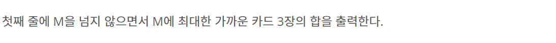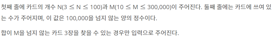 첫째 줄에 카드의 개수 N(3 ≤ N ≤ 100)과 M(10 ≤ M ≤ 300,000)이 주어진다. 둘째 줄에는 카드에 쓰여 있는 수가 주어지며, 이 값은 100,000을 넘지 않는 양의 정수이다. 합이 M을 넘지 않는 카드 3장