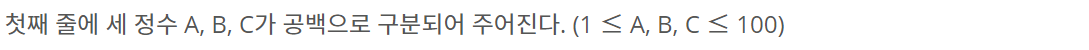 첫째 줄에 세 정수 A, B, C가 공백으로 구분되어 주어진다. (1 ≤ A, B, C ≤ 100)