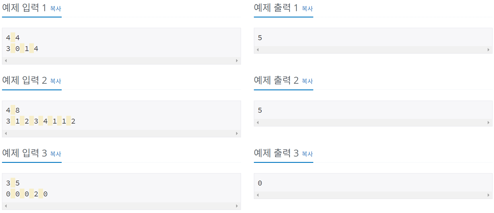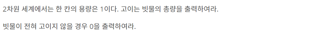 첫 번째 줄에는 2차원 세계의 세로 길이 H과 2차원 세계의 가로 길이 W가 주어진다. (1 ≤ H, W ≤ 500) 두 번째 줄에는 블록이 쌓인 높이를 의미하는 0이상 H이하의 정수가 2차원 세계의 맨 왼쪽 위치