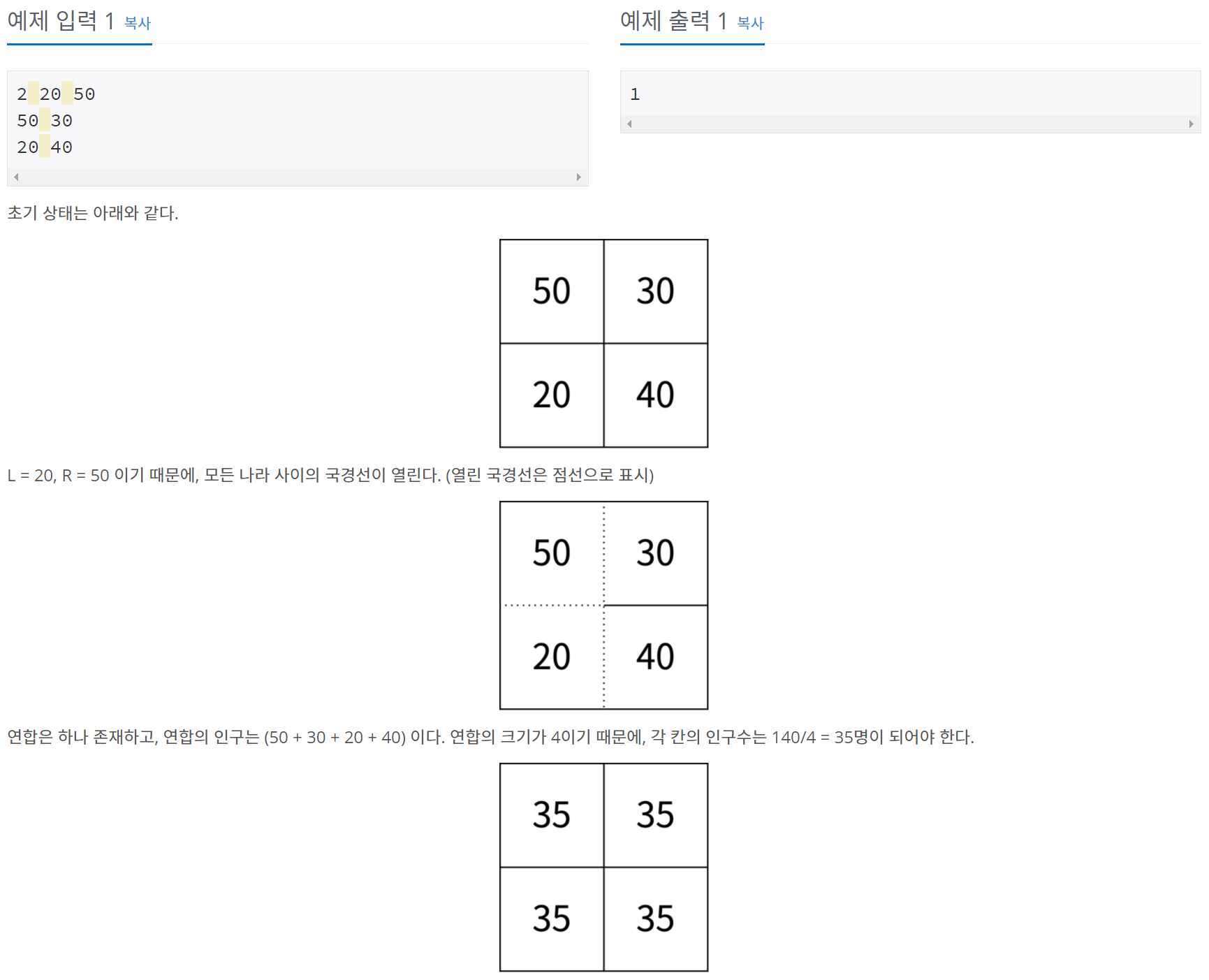 N×N크기의 땅이 있고, 땅은 1×1개의 칸으로 나누어져 있다. 각각의 땅에는 나라가 하나씩 존재하며, r행 c열에 있는 나라에는 A[r][c]명이 살고 있다. 인접한 나라 사이에는 국경선이 존재한다. 모