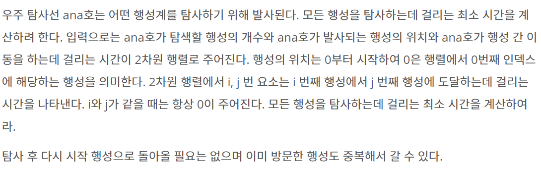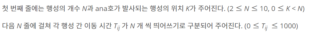 우주 탐사선 ana호는 어떤 행성계를 탐사하기 위해 발사된다. 모든 행성을 탐사하는데 걸리는 최소 시간을 계산하려 한다. 입력으로는 ana호가 탐색할 행성의 개수와 ana호가 발사되는 행성의 위
