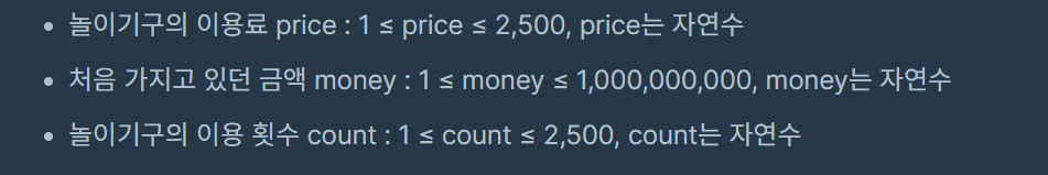 변수에 count 수만큼 이용 금액을 더해주고, 그 값이 내 돈 보다 적으면 0 출력