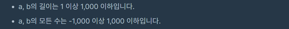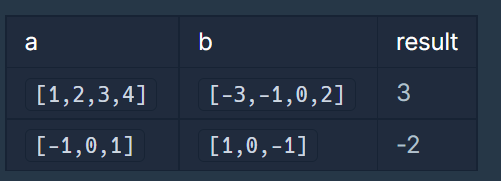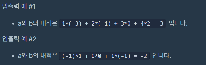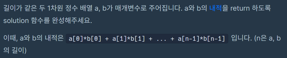 길이가 같은 두 1차원 정수 배열 a, b가 매개변수로 주어집니다. a와 b의 내적을 return 하도록 solution 함수를 완성해주세요. 이때, a와 b의 내적은 a[0]*b[0] + a[1]*b[1] + ... + a[n-1]*b[n-1] 입니다. (n은 a, b의
