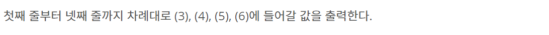 첫째 줄부터 넷째 줄까지 차례대로 (3), (4), (5), (6)에 들어갈 값을 출력한다.
