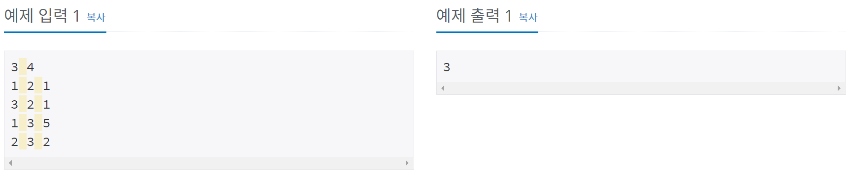 첫째 줄에 V와 E가 빈칸을 사이에 두고 주어진다. (2 ≤ V ≤ 400, 0 ≤ E ≤ V(V-1)) 다음 E개의 줄에는 각각 세 개의 정수 a, b, c가 주어진다. a번 마을에서 b번 마을로 가는 거리가 c인 도로가 있다는 의