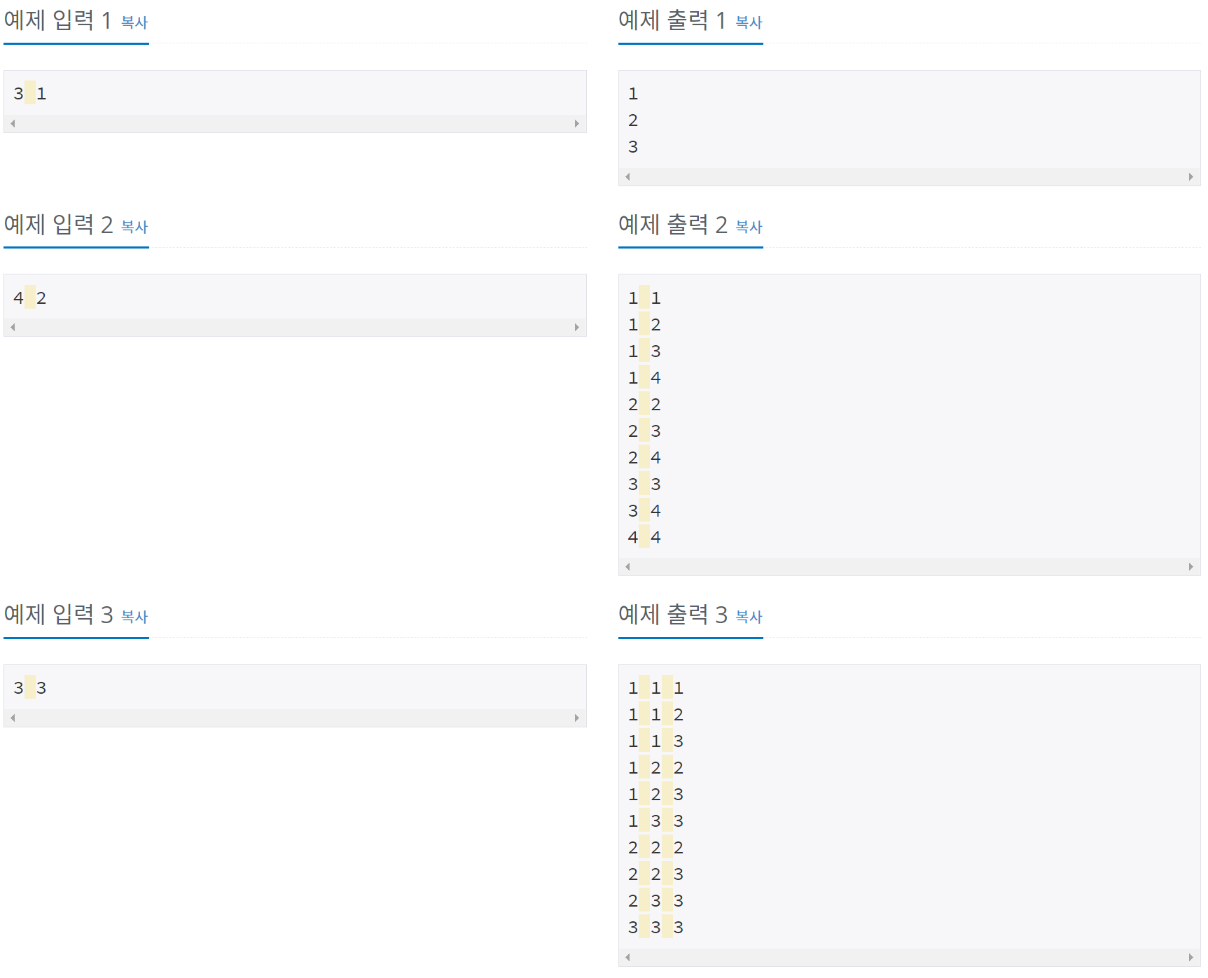한 줄에 하나씩 문제의 조건을 만족하는 수열을 출력한다. 중복되는 수열을 여러 번 출력하면 안되며, 각 수열은 공백으로 구분해서 출력해야 한다. 수열은 사전 순으로 증가하는 순서로 출력해