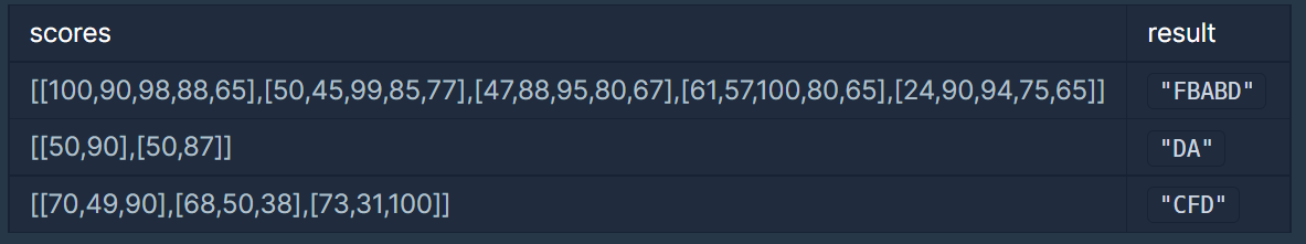 [[100,90,98,88,65],[50,45,99,85,77],[47,88,95,80,67],[61,57,100,80,65],[24,90,94,75,65]] "FBABD" [[70,49,90],[68,50,38],[73,31,100]] "CFD"