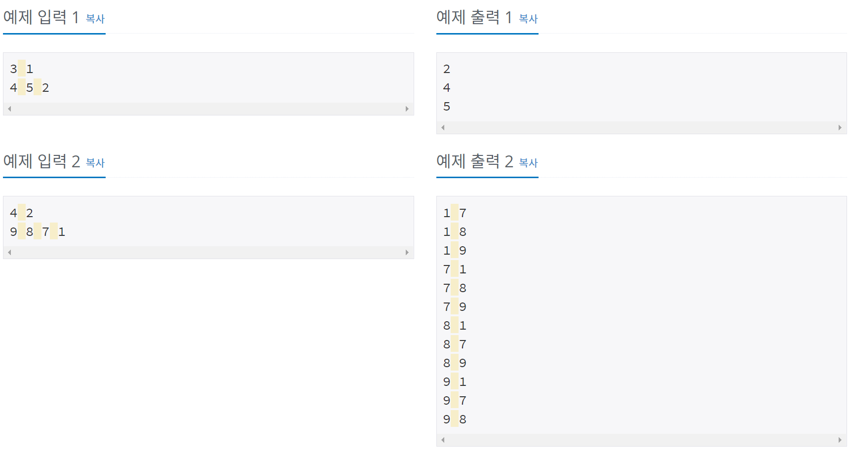 N개의 자연수와 자연수 M이 주어졌을 때, 아래 조건을 만족하는 길이가 M인 수열을 모두 구하는 프로그램을 작성하시오. N개의 자연수는 모두 다른 수이다. N개의 자연수 중에서 M개를 고른 수열
