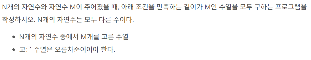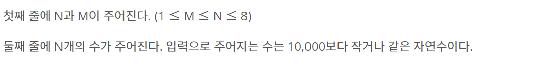 N개의 자연수와 자연수 M이 주어졌을 때, 아래 조건을 만족하는 길이가 M인 수열을 모두 구하는 프로그램을 작성하시오. N개의 자연수는 모두 다른 수이다. N개의 자연수 중에서 M개를 고른 수열