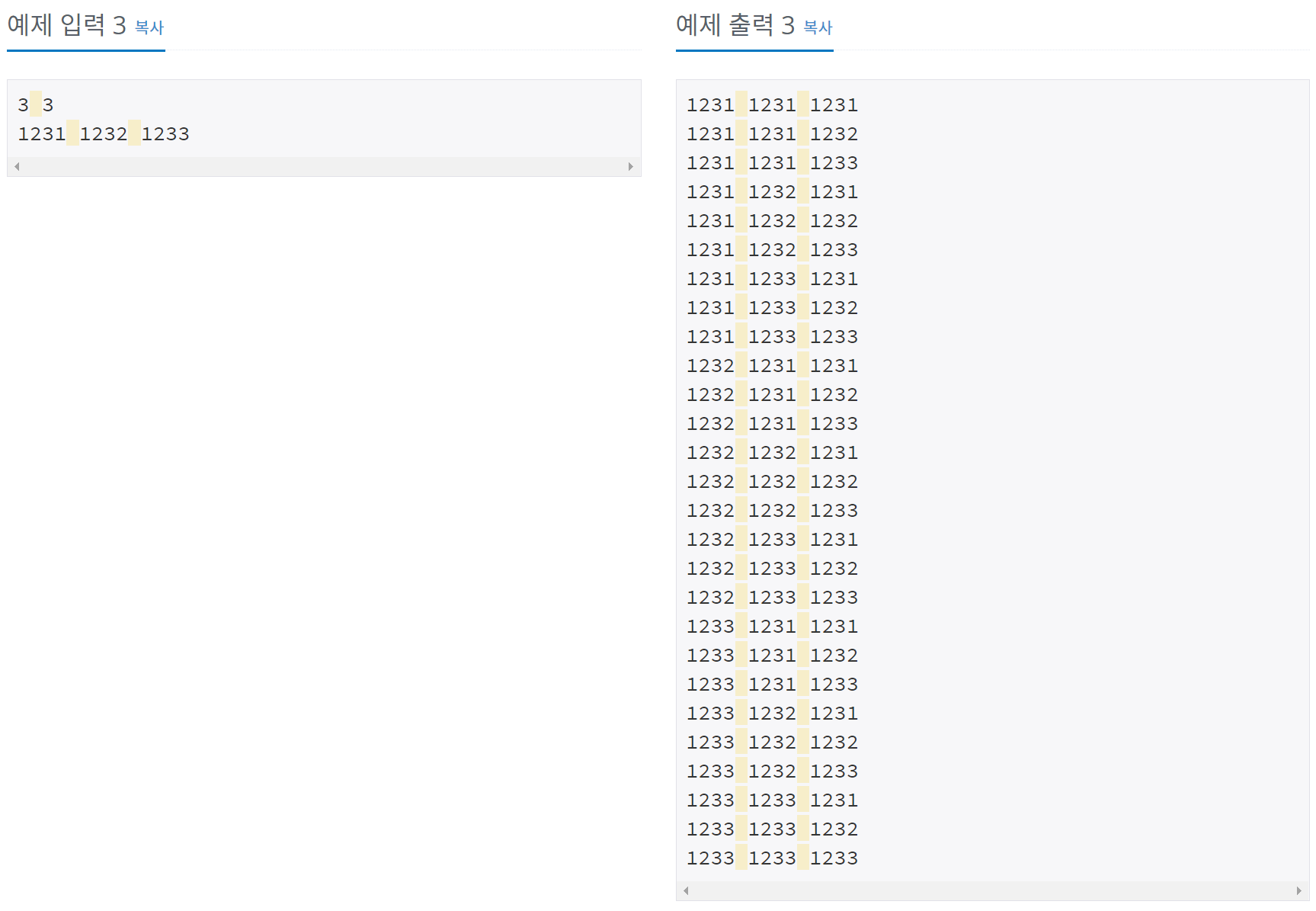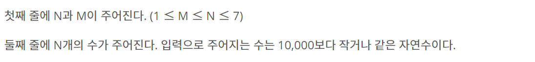 N개의 자연수와 자연수 M이 주어졌을 때, 아래 조건을 만족하는 길이가 M인 수열을 모두 구하는 프로그램을 작성하시오. N개의 자연수는 모두 다른 수이다. N개의 자연수 중에서 M개를 고른 수열